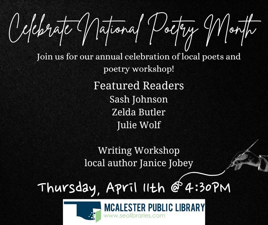 The Showcase will take place in the Whiteacre Room at the McAlester Public Library, with refreshments provided by the Friends of the Library. We hope to see you there!