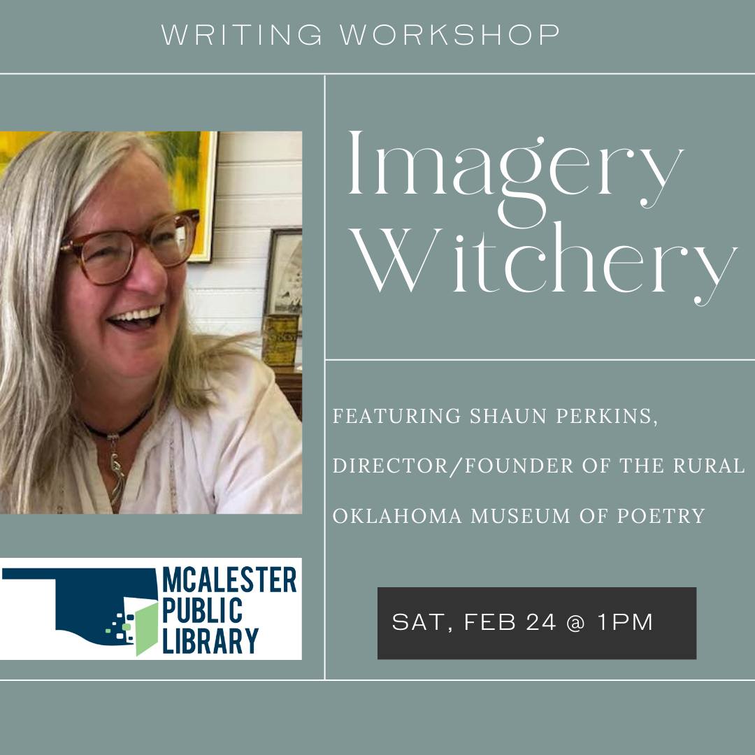 Many thanks to Rural Oklahoma Museum of Poetry Director, Shaun Perkins, who joined the McAlester Public Library Poetry Club to present her workshop, “Imagery Witchery”! The workshop tied into the poetry museum’s exhibit, “Her Kind,” now open for viewing at the Museum! For more information visit www.rompoetry.com.